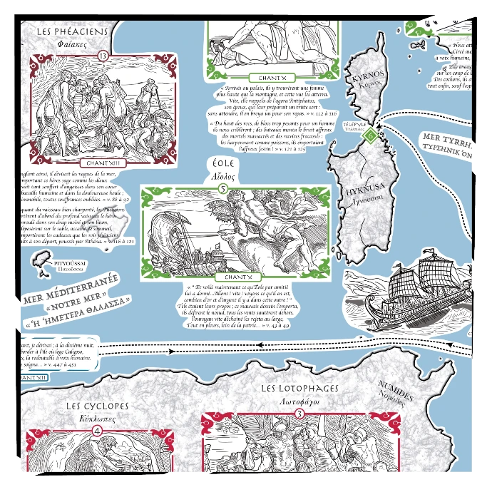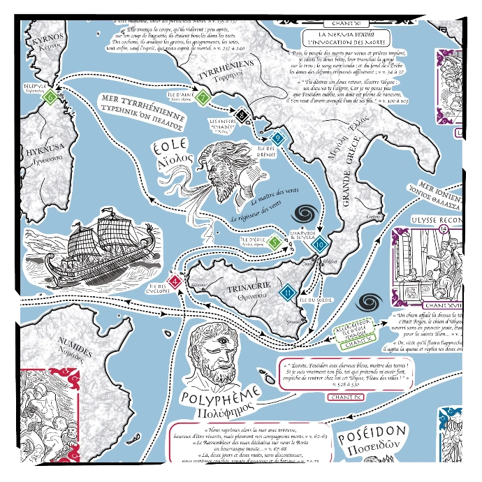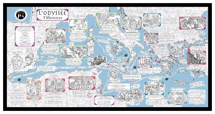Un mois de travail aura été nécessaire pour s’imprégner de cette oeuvre somme, faire les recherches et rendre le visuel que je voulais donner, les 14 étapes du retour depuis Troie et tous les dessins annexes sont tous dessinés à la main (l’ultime étape a été décomposée en 3 parties). Dans les versions couleur, les étapes ont été catégorisées selon leur chant d’appartenance.